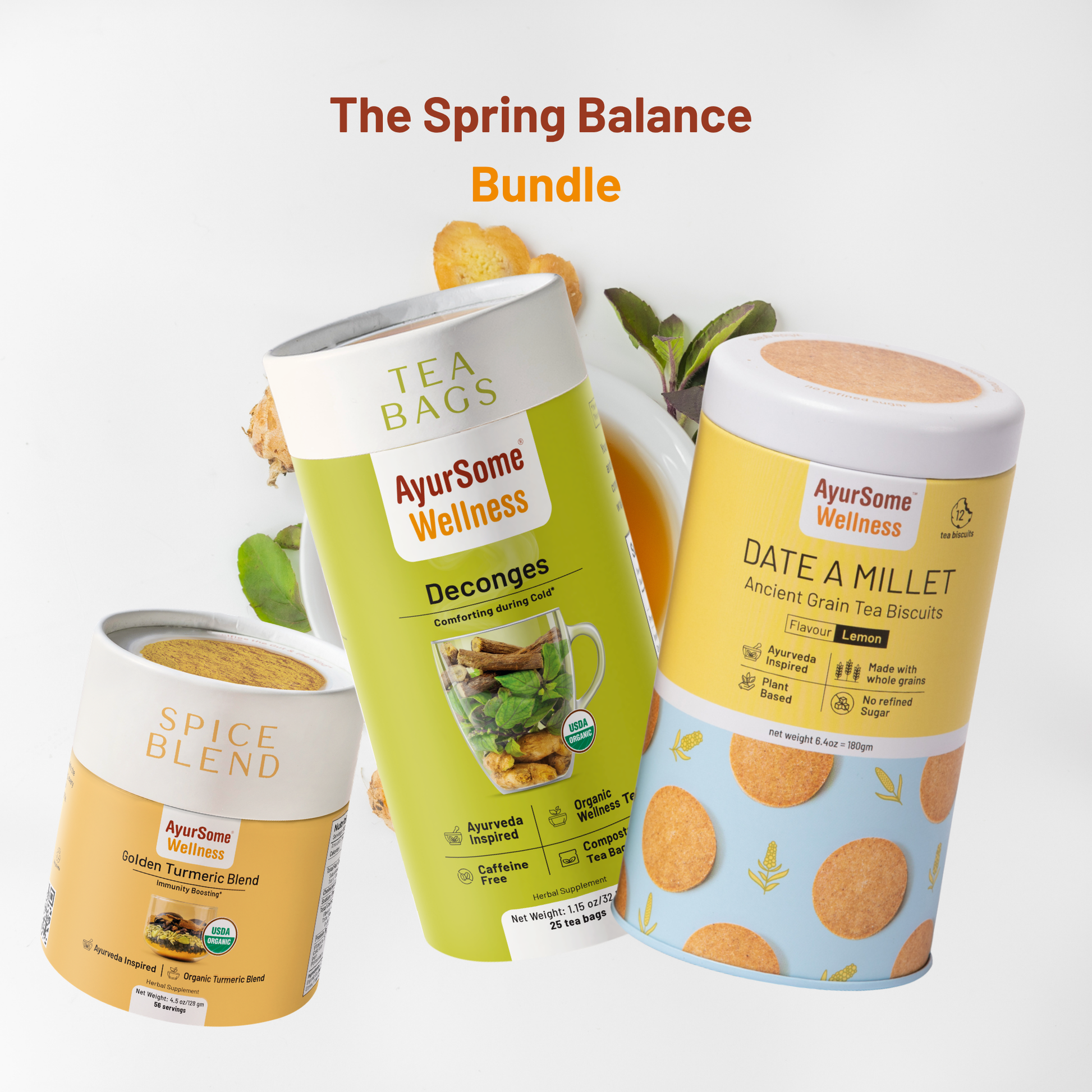 As the seasons shift, so does your body. This Spring Balance Bundle brings together three Ayurvedic essentials to help you transition with ease — breathe easy with Deconges Tea, nourish from within with our immunity boosting Golden Turmeric Blend, and stay grounded with Date-A-Millet Ancient Grain Biscuits.